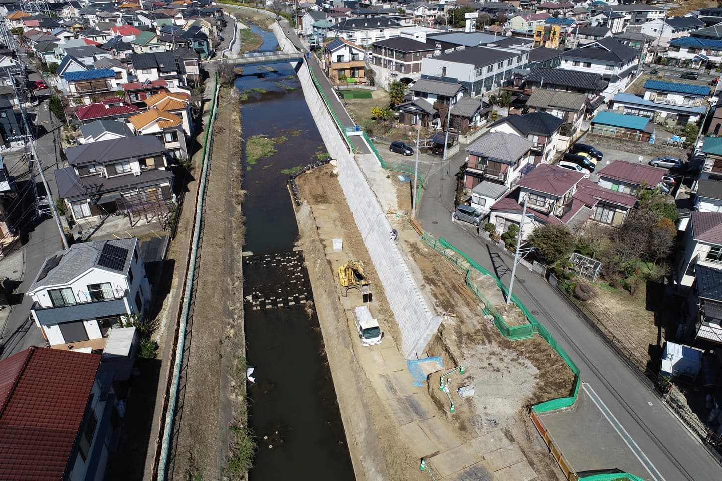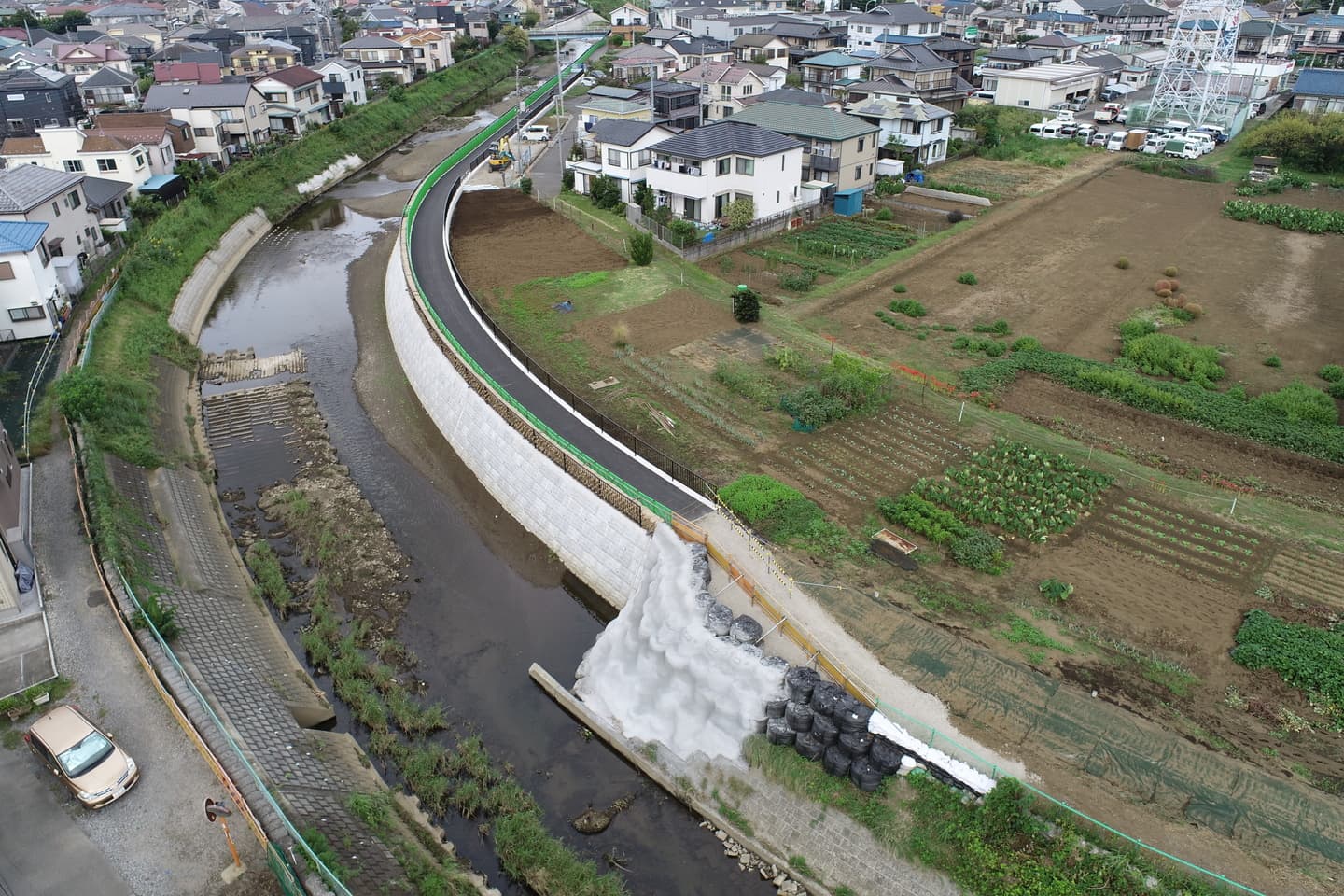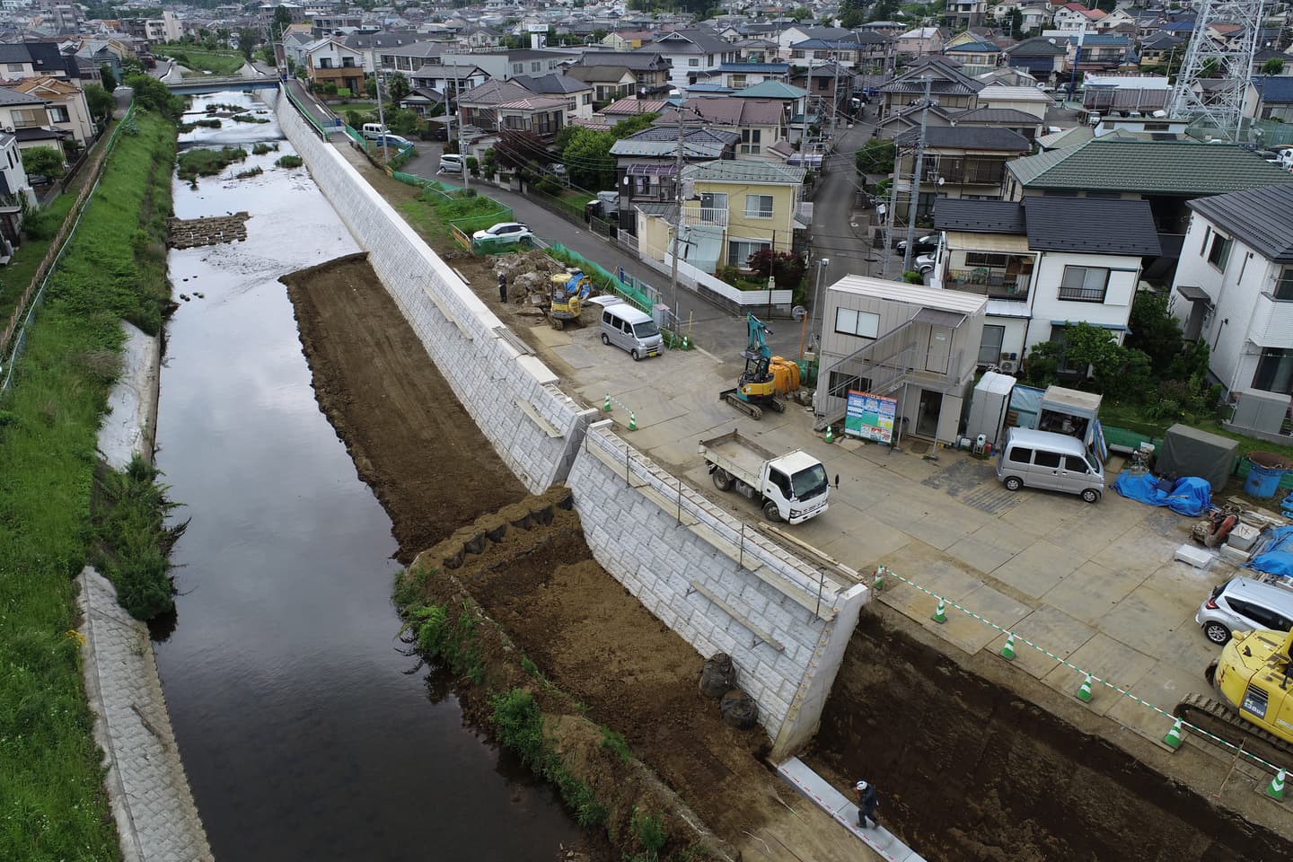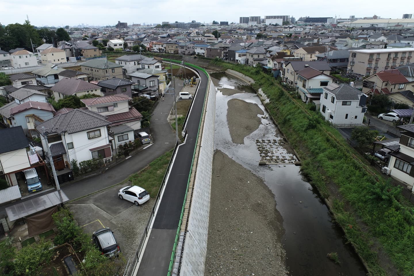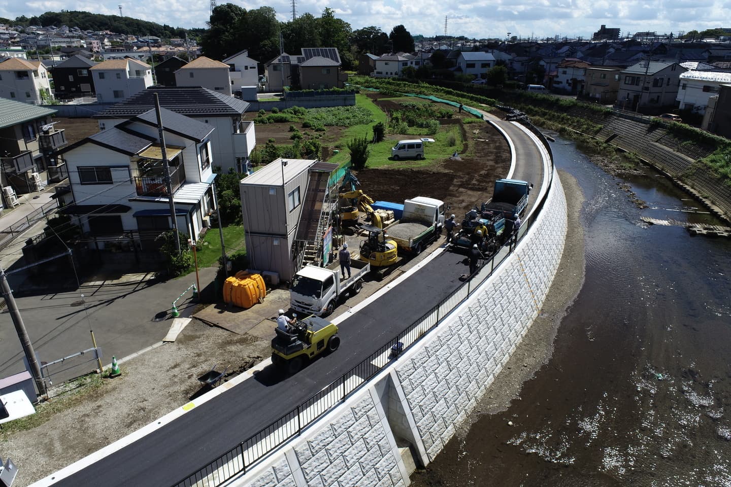 当初工期は8月31日でしたが、増水による影響等のため9月30日まで工期が延期されました。現場は護岸工および歩道側の擁壁が完成しています。今後はフェンスや歩道舗装を実施致します。
