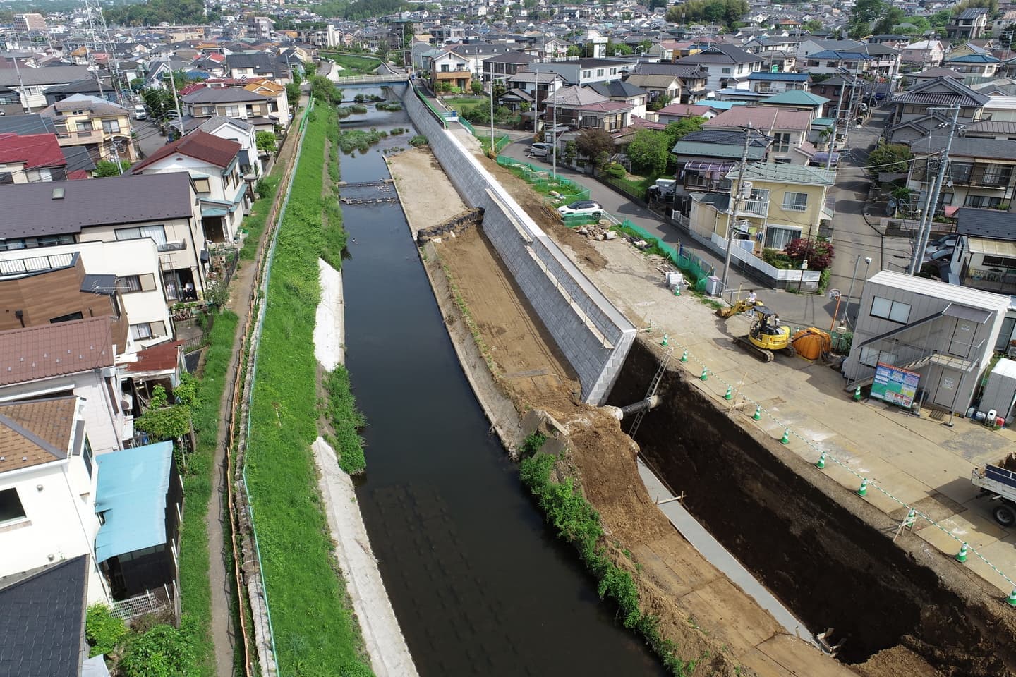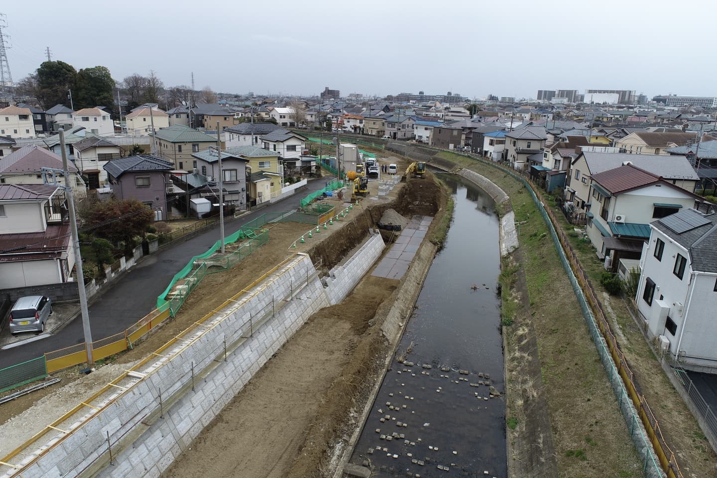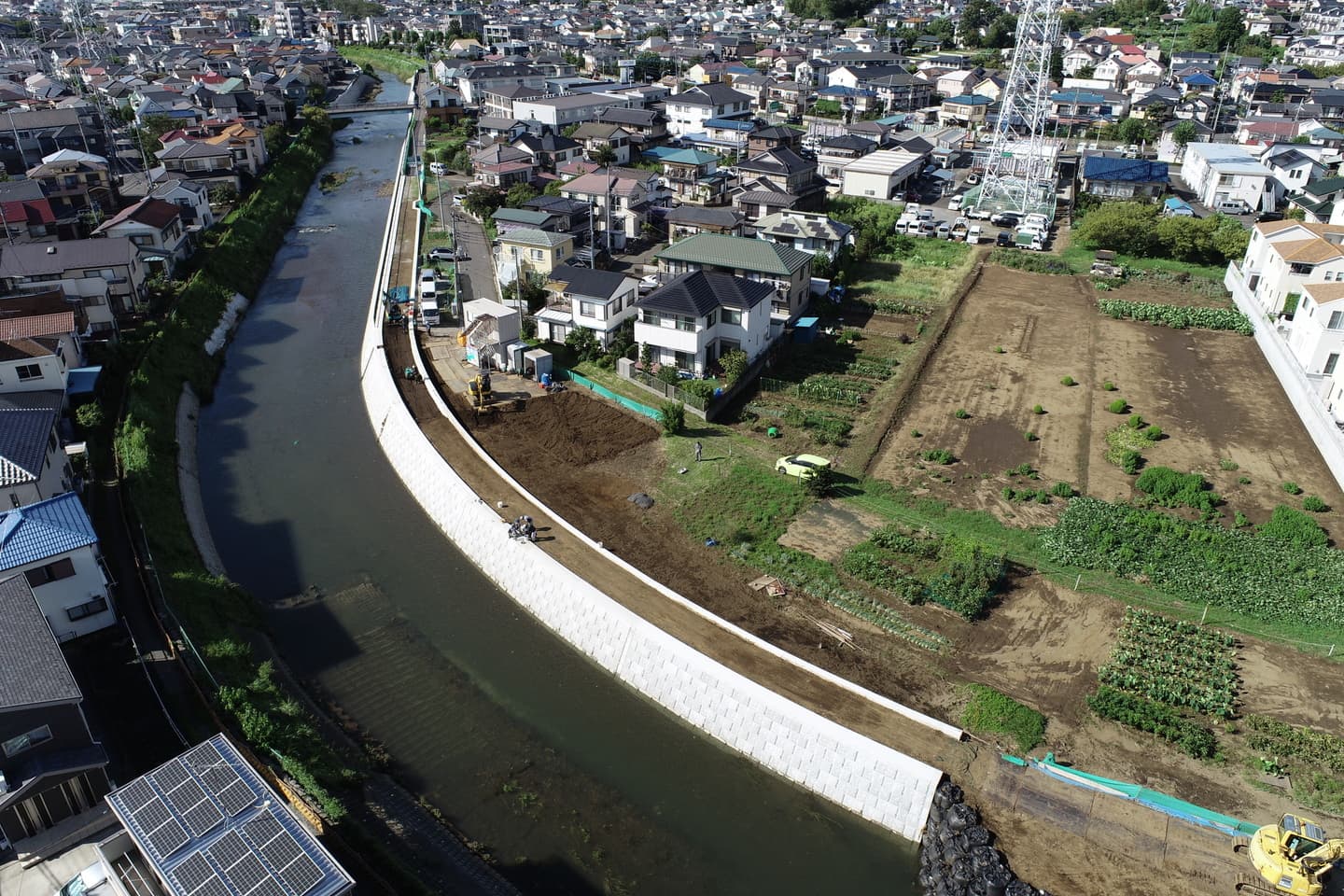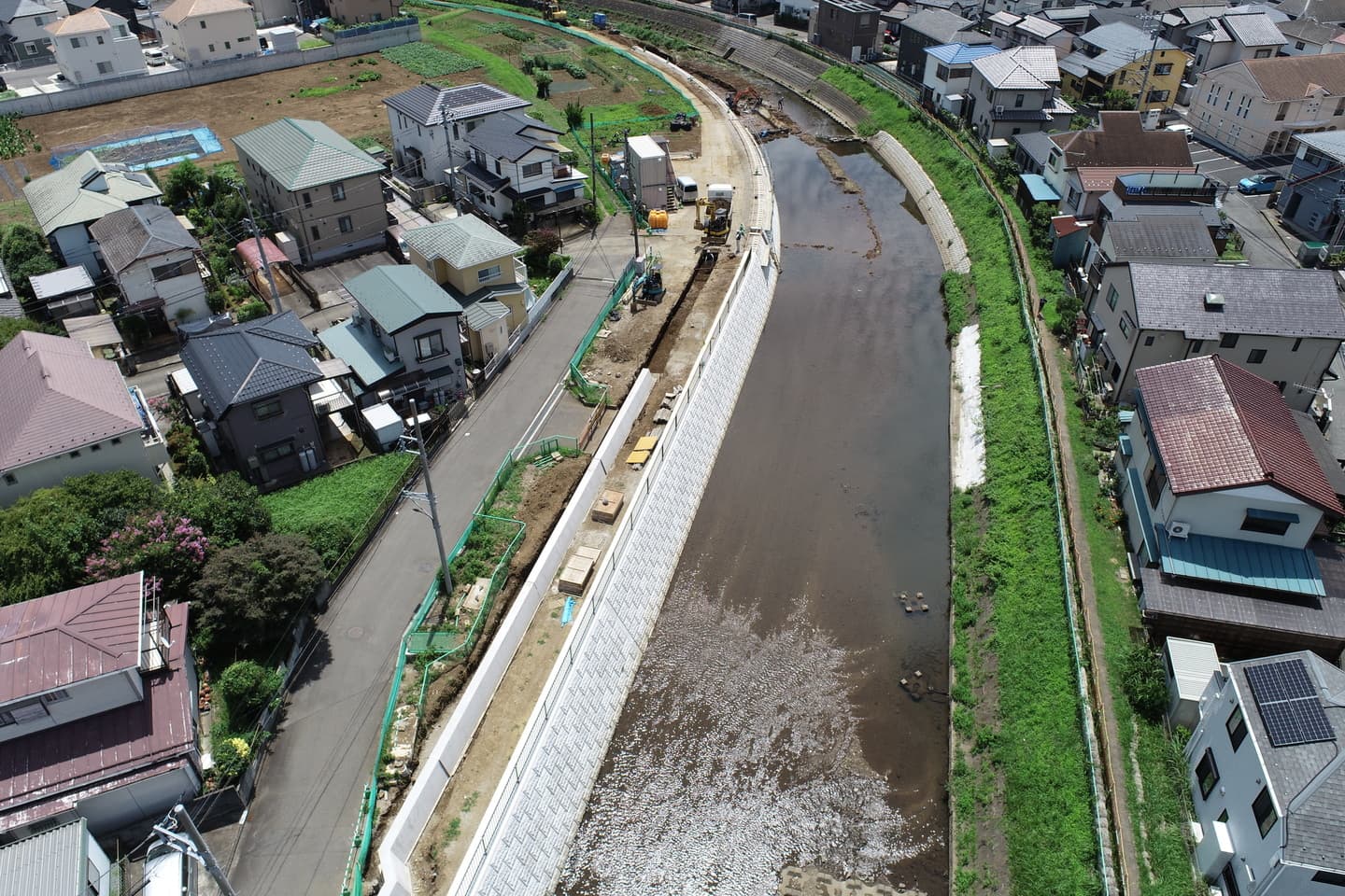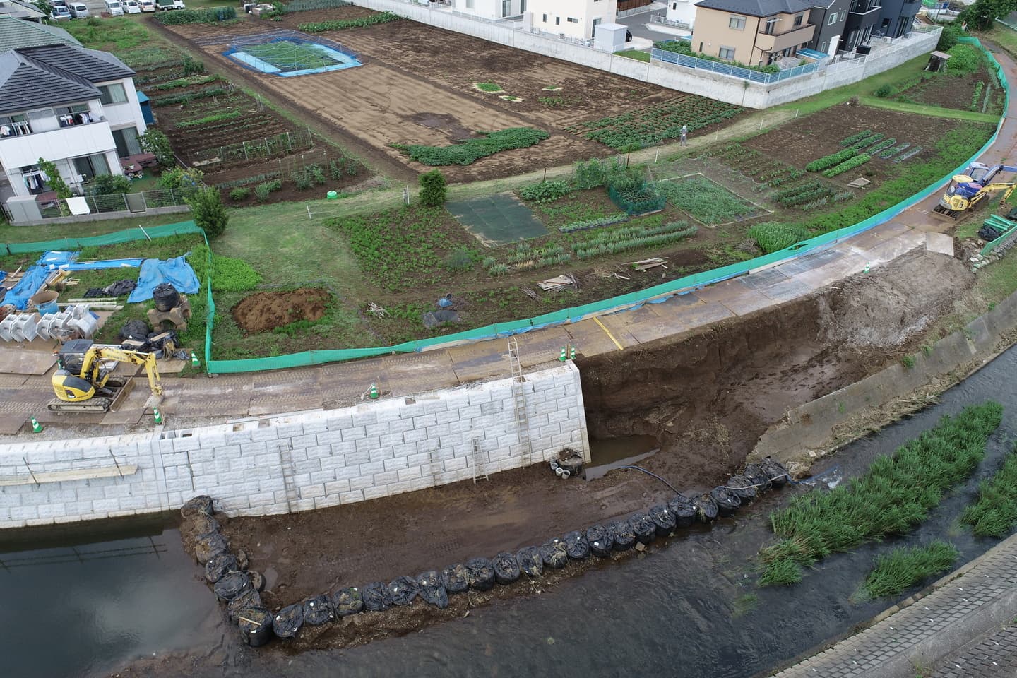 当初工期は8月31日でしたが、増水による影響等のため9月30日まで工期が延期されました。現場は護岸工および歩道側の擁壁が完成しています。今後はフェンスや歩道舗装を実施致します。